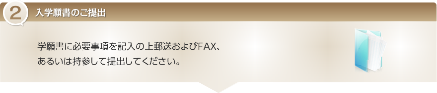 | 提出 | ◆指定の入学願書に必要事項を記入の上郵送およびFAX、あるいは持参して提出してください。