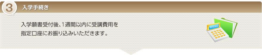 | 納入 | ◆入学願書受付後、1週間以内に受講費用を下記の指定口座にお振り込みいただきます。